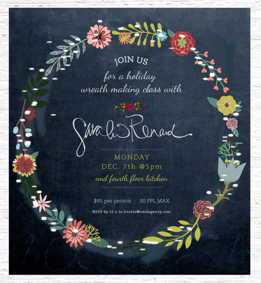 A couple of weeks ago I was asked to host a holiday wreath workshop and couldn't have been more excited to say yes. Lorien Steele designed a beautiful invitation for us and away we went with planning and prepping and making. Seven super fun ladies signed up and I think the finished products turned out beautifully. It's so fun, even as the instructor, to learn along with other creative people... thanks to everyone who attended!