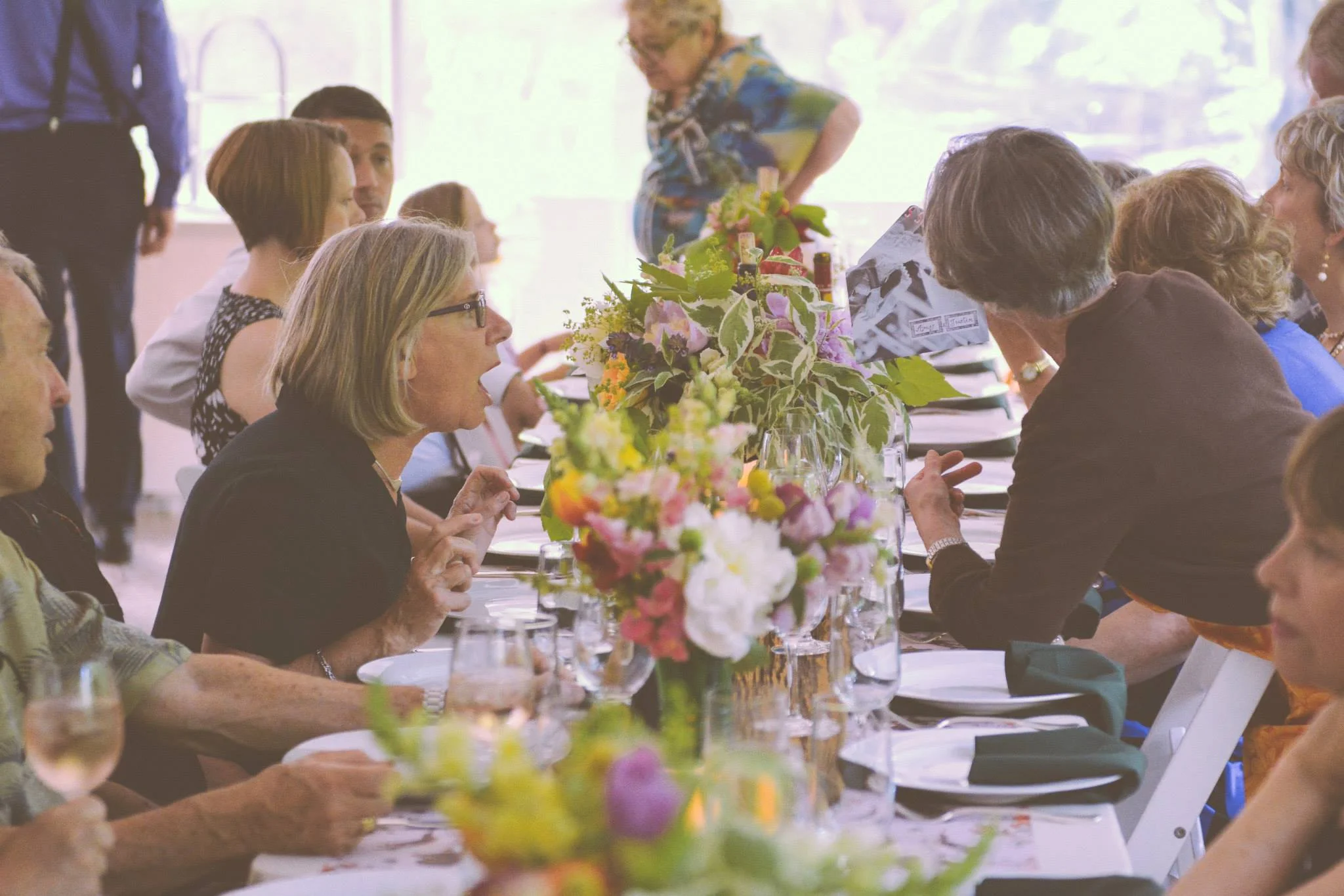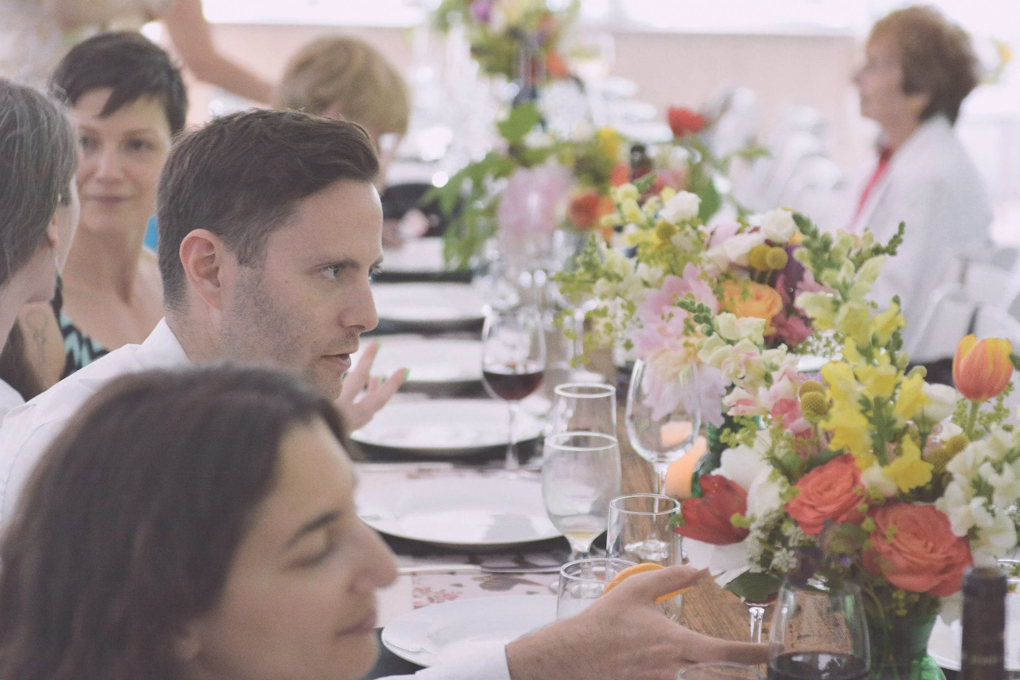 This summer I had the privilege of spending several days in Montreal to celebrate the union of Justin and Amy. They kept their guests busy with many fun events and lots of delicious food, and I kept myself busy creating more than 20 flower arrangements for their beautiful party. For their spring wedding, they wanted bright colors and a wildflower feel and they found some beautiful vintage green glass vases that really made the flowers pop.